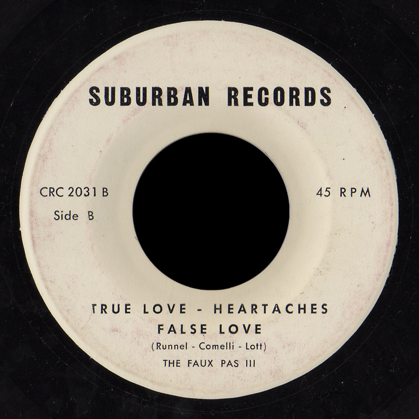 Runnel cut “True Love – Heartaches – False Love” for a second time at Cleveland Recording (not in Little Rock as noted elsewhere) in 1966, released on Suburban Records CRC 2031 (white labels). On this release the band is listed as simply the Faux Pas III. It was the b-side of “Baby What You Gonna Do”, a good New Orleans-type r&b.