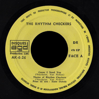 Returning to Strasbourg in December, they cut their first EP at the Kibitz Club, produced by Alain Dubois and pressed in 2000 copies on the Disques AGD label. “Cause I Need You” and “Theme of the Rhythm Checkers” are originals by Robby Stierheim and Eddy Van Nelfen.