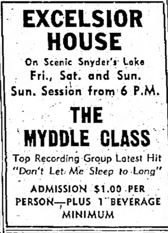 The Myddle Class traveled to Snyder’s Lake, near Troy, New York, to play two weekends, October 14, 15 & 16, and 21, 22 & 23 at the Excelsior House nightclub, which was then attracting college students and other young people (the drinking age was 18) four to five nights a week to see acts like the Critters, the Liverpool Set and the Knickerbockers.