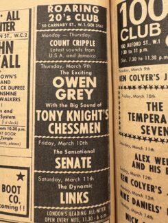 9 May 1967 – Speakeasy, Margaret Street, central London (Marylebone & Paddington Mercury/Melody Maker) Some of the live LP Garnet Mimms made with The Senate was recorded here