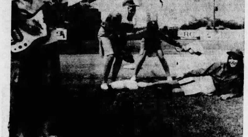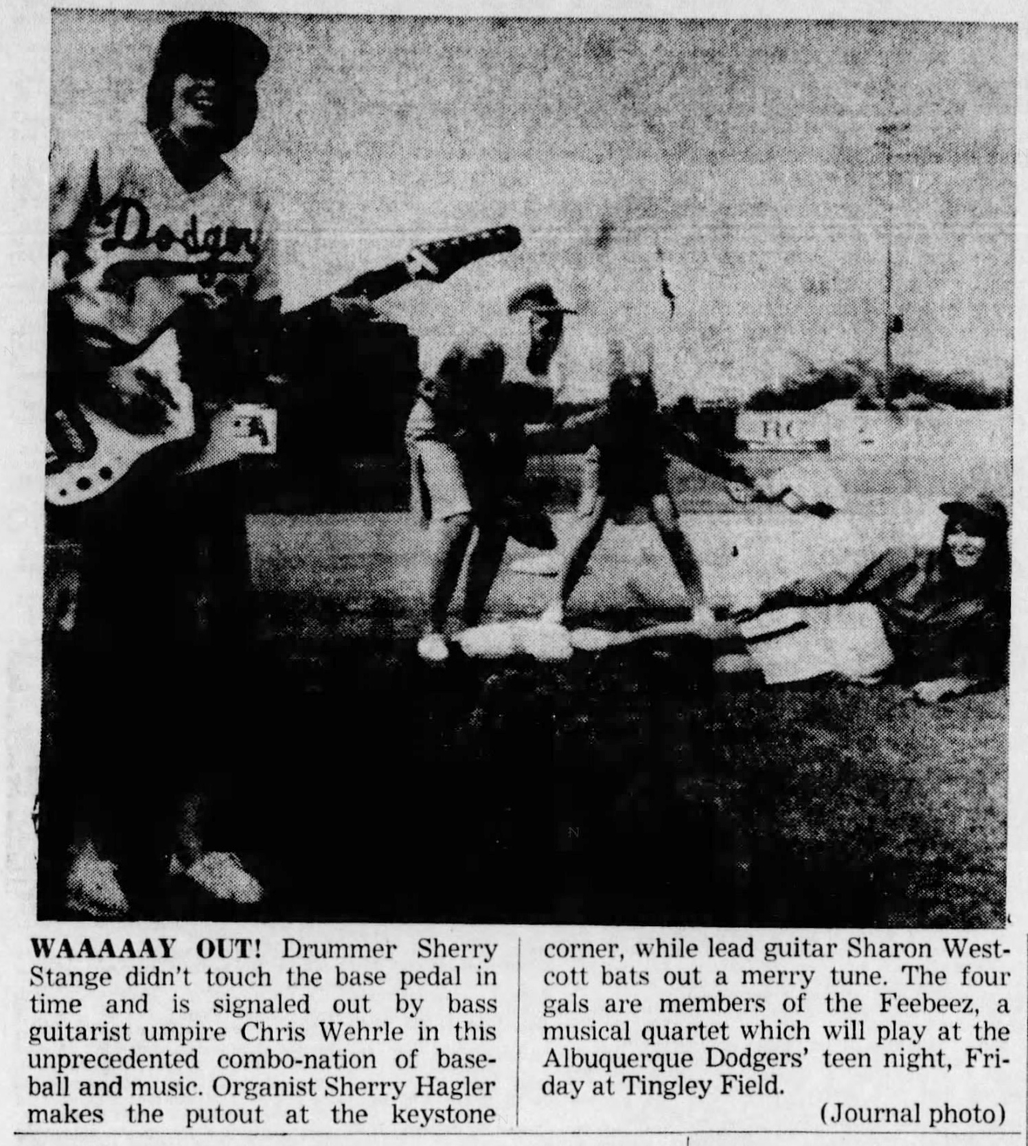 WAAAAAY OUT! Drummer Sherry Stange didn’t touch the base pedal in time and is signaled out by bass guitarist umpire Chris Wehre in this unprecedented combo-nation of baseball and music. Organist Sherry Hagler makes the putout at the keystone corner, while lead guitar Sharon Westcott bats out a merry tune. The four gals are members of the Feebeez, a musical quartet which will play at the Albuquerque Dodgers’ teen night, Friday at Tingley Field.