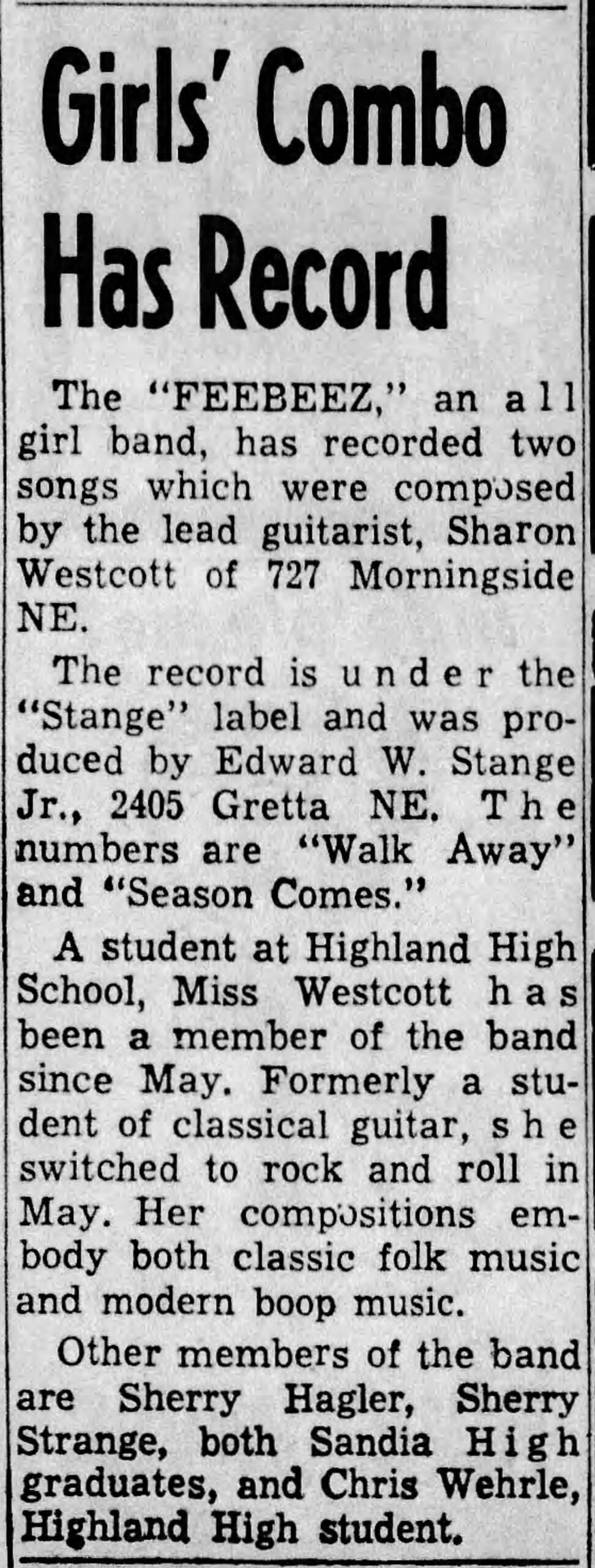 The “FEEBEEZ,” an all girl band, has recorded two songs which were composed by the lead guitarist, Sharon Westcott of 727 Morningside NE.