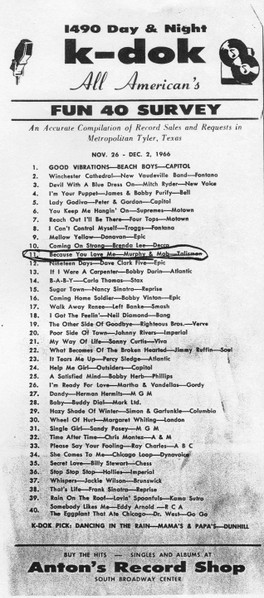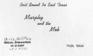 The group played live at a local teen club called The Plum, at the Bergfeld Park ampitheatre, at the YMCA and at their Catholic high school. At the Bergfeld Park battle of the bands produced by Rodney Kamel, Murphy & the Mob would compete with The Marauders (from Troup, TX), the Hobos from Jacksonville, and the Indifferents from Tyler, featuing Terry’s friend Sam Blanchard. (The Indifferents had a 45 on Valor, “Cindy” / “She’ll Be Back”).