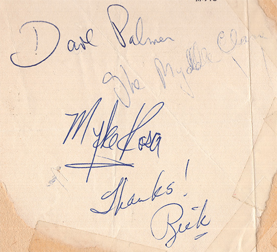 Autographs of Dave Palmer, Myke Rosa and Rick Philp of the Myddle Class, from the Excelsior House, October 1966Autographs of Charlie Larkey and Dan Mansolino of the Myddle Class, from the Excelsior House, October 1966
