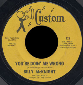 Out of Tyler, Texas come Billy McKnight & The Plus 4 on the Custom label. “You’re Doin’ Me Wrong” is a fine Yardbirds-influenced punker, the drumming is especially fluid. An odd feature is the way the song fades out twice, each time coming back with a shrill keyboard note.