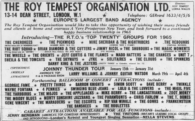 The changes, however, didn’t end there. Sax player Malcolm Randall left in early February and subsequently joined Bognor Regis band Beau Brummell & The Noblemen for about six months. In July 1965, he jumped ship to join Manchester’s Playboys.