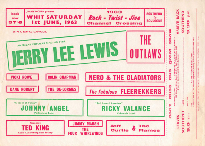 1 June 1963 – Rock Twist Jive Channel Crossing with Jerry Lee Lewis & The Outlaws, The Four Whirlwinds, The Del-Lormes, Johnny Angel, Nero & The Gladiators, Dane Robert, Vicki Rowe, Ricky Valance, The Fabulous Fleerekkers, Colin Chapman and Jimmy Marsh