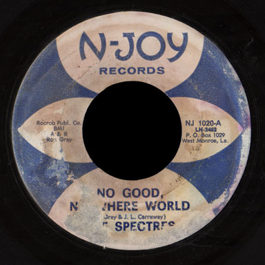 Monroe was also the base for the N-Joy label, run by Rocky Robbins. Both sides of the Spectres 45 were written by Ron Gray and J.L. Carraway. Gray did A&R for the label and had his own group, the Countdowns, with whom he released three earlier 45s on the N-Joy label, some of which I hope to feature soon. I’d be interested to know why he had the Spectres record these songs instead of his own group.