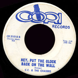 C.C. & the Chasers have just this one 45 on the Cori label from 1967, “Hey, Put the Clock Back on the Wall” / “Two and Twenty”
