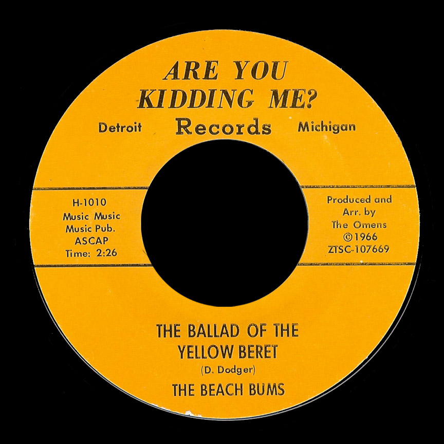 In early 1966 Sgt. Barry Sadler had a #1 hit with that paen to the american soldier, “Ballad of the Green Beret.” The Beach Bums (actually Bob Seger singing when he was with Doug Brown and the Omens) adapted it for their “protest against protesters”, “The Ballad of the Yellow Beret.” It’s not really a parody of the Sadler song as a straight up mocking of draft-dodgers.